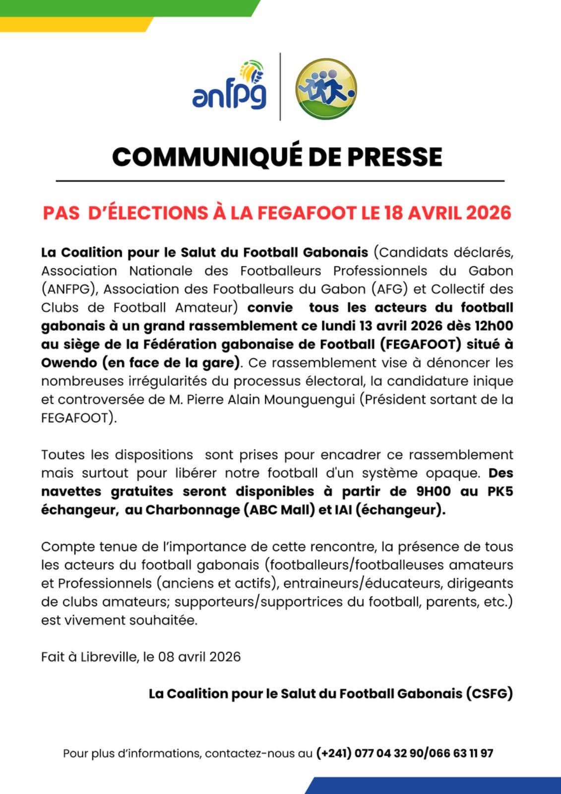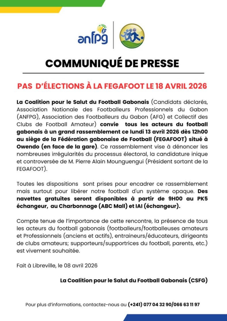 Il n’y aura pas d’élection à la FEGAFOOT le 18 avril 2026. C’est, en substance, le message affiché en lettres capitales dans le communiqué de presse de la Coalition pour le salut du football gabonais (CSFG), publié ce mercredi 8 avril 2026, en collaboration avec l’Association nationale des footballeurs professionnels du Gabon (ANFPG).